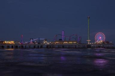 Keywords: galveston amusements skyline texas lights dusk ferris wheel rides pier shore island water reflection gulf of mexico shore historic night twilight evening cityscape landmark