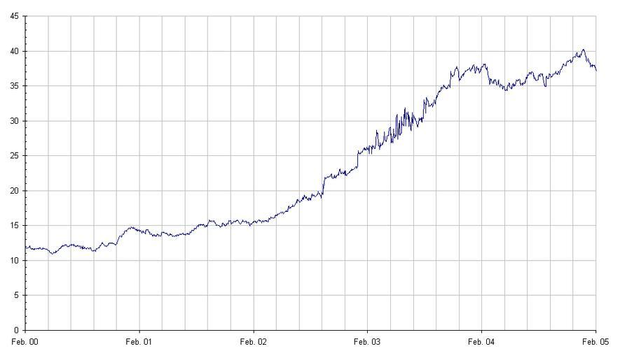 Keywords: Gambia dalasi 5Jahre.png Beschreibung Kursverlauf EUR/GMD Zeitskala 5 Jahre Quelle Chart selbst erstellt am 09 Februar 2005 Fotograf oder Zeichner --Atamari 16 08 9 Feb 2005 UTC Money of Gambia Graphics by User Atamari Euro exchange rate charts 2005 in Gambia |