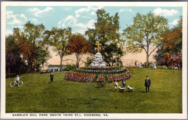 | Keywords: vcu libraries vculibraries vcu digital collections vcudigitalcollections photo border outdoor plant grass park landscape field yard Description: Situated at the southern extremity of 3rd and 4th street, Gamble's Hill Park, though limited in area, commands a magnificent panoramic view of the falls of the James River and the surrounding countryside. Winding the foot of the hill is the old James River and Kanawha Canal, the tow path of which being now occupied by a division of the C & O Ry. The stone cross appearing in this view was erected to commemorate the first visit of white men to [the] present site of Richmond, in 1607 when Capt. John Smith and party ascended the river as far as the falls. Manufacturer: Southern Bargain House, Richmond, Va. Date Postmarked: Not postmarked. Rights: This item is in the public domain. Acknowledgement of the Virginia Commonwealth University Libraries as a source is requested. Reference URL: dig.library.vcu.edu/u?/postcard,656 Collection: Rarely Seen Richmond: Early twentieth century Richmond as seen through vintage postcards Description: Situated at the southern extremity of 3rd and 4th street, Gamble's Hill Park, though limited in area, commands a magnificent panoramic view of the falls of the James River and the surrounding countryside. Winding the foot of the hill is the old James River and Kanawha Canal, the tow path of which being now occupied by a division of the C & O Ry. The stone cross appearing in this view was erected to commemorate the first visit of white men to [the] present site of Richmond, in 1607 when Capt. John Smith and party ascended the river as far as the falls. Manufacturer: Southern Bargain House, Richmond, Va. Date Postmarked: Not postmarked. Rights: This item is in the public domain. Acknowledgement of the Virginia Commonwealth University Libraries as a source is requested. Reference URL: dig.library.vcu.edu/u?/postcard,656 Collection: Rarely Seen Richmond: Early twentieth century Richmond as seen through vintage postcards |
