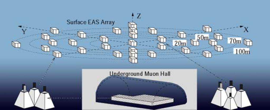 Keywords: Gamma Experiment diagrammatic layout.png en The surface extensive air shower detector stations of GAMMA Experiment are located on 5 concentric circles of radii 20 28 50 70 and 100 m Each station contains 3 square plastic scintillation detectors 3x 1x1x0 05 m<sup>3</sup> to measure the energy deposit of shower charged particles A photomultiplier tube is positioned on the top of the aluminum casing covering each scintillator One of the three detectors of each station is examined by two photomultipliers one of which is designed for fast timing measurements 150 underground muon scintillation detectors muon carpet are compactly arranged in the underground hall under 2 3 Kg/cm<sup>2</sup> of concrete and rock to detect shower muon component with energies more that ~5 GeV GAMMA Collaboration http //www gamma-armenia org/ Samvel Ter-Antonyan 2010-01-10 Cosmic rays |