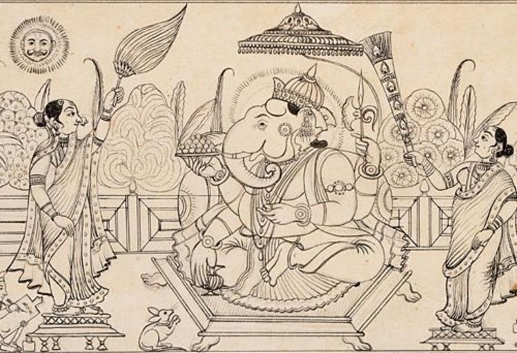 | Keywords: Ganesha ink.jpg  Ink drawing of Ganesha under an umbrella with his two wives who are fanning him His rat is in the foreground to the left The sun with a face shines upon the scene Various trees in the background Ganesja under ein parasoll med dei to konene sine som vifter han Sol med fjes i himmelen rotta han rir på i forgrunnen tre i bakgrunnen India Karnataka Mysore Bhagavata Purana Ancient Stories of the Lord Manuscript Museum Number M 91 349 4 LACMA http //www mythfolklore net/india/galleries/2/ganesha_ink htm early 19th century author PD-art Paintings of Ganesha Ink drawings 19th-century drawings Drawings of people of India Bhagavata Purana Paintings from Karnataka Polygamy Drawings from India in the Los Angeles County Museum of Art Mysore in the 1800s Chamara Rats in art 1800s paintings from India Manuscripts from India in the Los Angeles County Museum of Art |