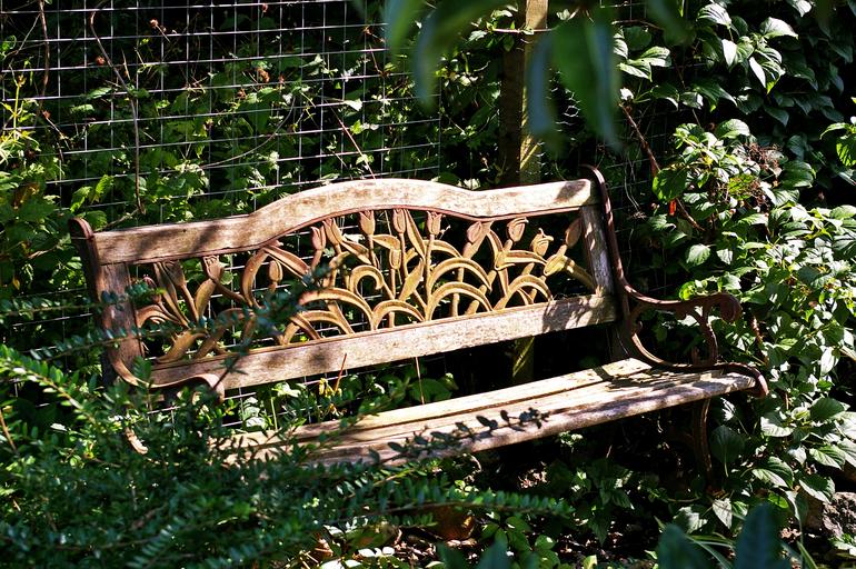Keywords: garden bench bank rest seat wood nature seating area relax shadow space garden park iron sunshine ornament wrought iron idyllic