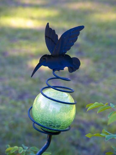Keywords: garden decoration hummingbird blue green bowl metal spiral close-up