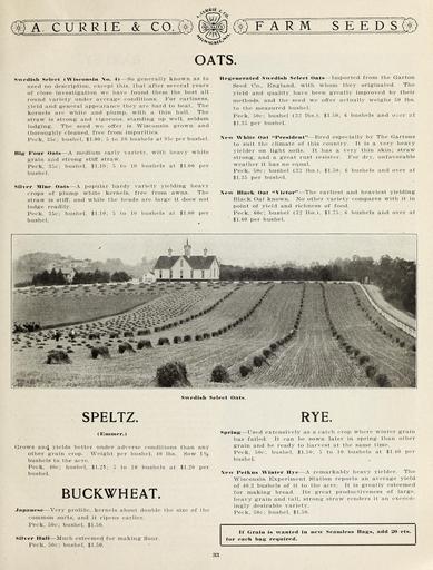 | Keywords: Garden and farm seeds (16185049538).jpg except this that after several years <br> of close investigation we have found them the best all <br> round variety under average conditions For earliness <br> yield and general appearance tiny are hard to beat The <br> kernels are white and plump with a thin hull The <br> straw is strong and vigorous standing up well seldom <br> lodging The seed we offer is Wisconsin grown and <br> thoroughly cleaned free from impurities <br> Peck 35c; bushel 1 00; 5 to 10 bushels at 95c per bushel <br> Hits Four Oats A medium early variety with heavy white <br> grain and strong stiff straw <br> Peck 35c; bushel 1 10; 5 to 10 bushels at 1 00 per <br> bushel <br> Silver Mine Oat s A popular hardy variety yielding heavy <br> crops of plump white kernels free from awns The <br> straw is stiff and while the heads are large it does not <br> lodge readily <br> Peck 35c; bushel 1 10; 5 to 10 bushels at 1 00 per <br> bushel <br> Heg-enernted Swedish Select Onts Imported from the Garton <br> Seed Co England with whom they originated The <br> yield and quality have been greatly improved by their <br> methods and the seed we offer actually weighs 50 lbs <br> to the measured bushel <br> Peck 50c; bushel 32 lbs 1 50; 6 bushels and over at <br> 1 35 per bushel <br> New White Oat President Bred especially by The Gartons <br> to suit the climate of this country It is a very heavy <br> yielder on light soils It has a very thin skin; straw <br> strong and a great rust resister For dry unfavorable <br> weather it has no equal <br> Peck 50c; bushel 32 lbs 1 50; 6 bushels and over at <br> 1 35 per bushel <br> New Black Oat Victor The earliest and heaviest yielding <br> Black Oat known No other variety compares with it in <br> point of yield and richness of food <br> Peck 60c; bushel 32 lbs 1 75; 6 bushels and over at <br> 1 60 per bushel <br> WKWMmBM81WW3fa t ~ 'iM <br> W 1 ' <br> Swedish Select Oats <br> SPELTZ <br> Emitter <br> Grows and yields better under adverse conditions than any <br> other grain crop Weight per bushel 40 lbs Sow 1 <br> bushels to the acre <br> Peck 40c; bushel 1 2ri; 5 to 10 bushels at 1 20 per <br> bushel <br> BUCKWHEAT <br> Japanese Very proline kernels about double the size of the <br> common sorts and it ripens earlier <br> Peck 50c; bushel 1 50 <br> Silver Hull Much esteemed for making flour <br> Teck 50c; bushel 1 50 <br> RYE <br> Spring' Used extensively as a catch crop where winter grain <br> has failed It can be sown later in spring than other <br> grain and be ready to harvest at the same time <br> Peck 50c; bushel 1 50; 5 to 10 bushels at 1 40 per <br> bushel <br> New Petkus Winter Rye A remarkably heavy yielder The <br> Wisconsin Experiment Station reports an average yield <br> of 40 3 bushels of it to the acre It is greatly esteemed <br> for making bread Its great productiveness of large <br> heavy grain and tall strong straw renders it an exceed- <br> ingly desirable variety <br> Peck 50c; bushel 1 50 <br> If Grain is wanted in new Seamless Dags add 20 cts <br> for each hag' required <br> 3 1 42156485 132761 65916 Page 33 Text http //www biodiversitylibrary org/page/42156485 1912 10 5962/bhl title 65916 A Currie Company ; Henry G Gilbert Nursery and Seed Trade Catalog Collection Biodiversity Heritage Library Garden and farm seeds spring 1912 Garden Stories Bulbs Plants Catalogs Equipment and supplies Flowers Gardening Nurseries Horticulture Plants Ornamental Seeds Vegetables U S Department of Agriculture National Agricultural Library bhl page 42156485 dc identifier http //biodiversitylibrary org/page/42156485 bhlGardenStories BHLinbloom bulbs plants nurseries horticulture plants ornamental u s department of agriculture national agricultural library bhlgardenstories bhlinbloom Information field Flickr posted date ISOdate 2015-01-26 Check categories 2015 August 25 CC-BY-2 0 BioDivLibrary https //flickr com/photos/61021753 N02/16185049538 2015-08-25 06 53 50 cc-by-2 0 PD-old-70-1923 Garden and farm seeds 1912 Photos uploaded from Flickr by FĂŚ using a script |