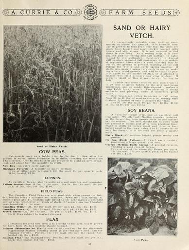 Keywords: Garden and farm seeds (16186818457).jpg Sand or Hairy Vetoh <br> COW PEAS <br> Extensively used as a fodder crop in the South Sow after the <br> ground is warm either broadcast or in drills covering- the seed from <br> 2 to 3 inches One to two bushels are required to plant an acre broad- <br> cast and about half the quantity in drills <br> New Era An extra early variety <br> Michigan Favorite A favorite in many sections <br> Price of either sort per quart 20c by mail 35c per quart ; peck <br> 1-00; bushel 3 50 <br> LUPINES <br> An excellent forage also valuable as a soil enricher and renovator <br> Yellow Seeded Sow 90 lbs to the acre Per lb 10c by mail 20c per <br> lb ; 10 lbs 85c; 100 lbs 7 00 <br> FIELD PEAS <br> The Canadian Field Peas are very profitable when grown for fod- <br> der besides being a valuable soil enricher Sown with oats using - 1 <br> bushels peas and 1 bushels oats mixed to the acre makes a splendid <br> soiling crop relished by all kinds of stock If sown alone use 3 bushels <br> peas broadcast to the acre <br> Canadian White Qt 15c by mail 30c per qt ; pk 65c; bu 2 25 <br> Canadian Green Qt 20c by mail 35c per qt ; pk 1 00; bu 3 75 <br> Scotch Green Qt 20c by mail 35c per qt ; pk 1 00; bu 3 75 <br> Field Peas subject to market changes <br> FLAX <br> If wanted for seed sow from 2 to 3 pecks to the acre but if grown <br> for fibre from 1V 2 to 2 bushels should be used <br> Priniost Minnesota I\o 25 A new variety sent out by the Minnesota <br> Experiment Station yielding about 20 per cent more seed than the <br> common variety Per lb 10c by mail 20c per lb ; peck 85c; <br> bushel 56 lbs 3 00 <br> Russian Flax The standard sort Per lb 10c by mail 20c per lb ; <br> peck 75c; bushel 56 lbs 2 50 <br> FARM SEEDS <br> SAND OR HAIRY <br> VETCH <br> An exceedingly valuable crop yielding' enor- <br> mously on almost any ground It is biennial sim- <br> ilar in growth to field peas only that the vines are <br> much finer longer and more thickly covered with <br> leaves and side stems It is not unusual to find <br> vines 10 feet long As a soiling crop it is une- <br> qualled and for spring and fall pasture its value <br> cannot be over-estimated Seed sown in August <br> will produce splendid fall pasturage by the middle <br> of September after which a good covering may be <br> left on the ground to prevent washing of the soil <br> during the winter and early spring months It <br> starts into growth again very early in spring mak- <br> ing a very rapid growth and will be ready to pas- <br> ture again by the middle of May or if allowed to <br> mature will yield a heavy hay crop in June If <br> sown in April or May it may be cut for hay in <br> July <br> It yields enormous crops on rich soil; from 15 <br> to 20 tons of green fodder to the acre not being <br> uncommon and on sandy thin ground it makes a <br> remarkably heavy growth For planting in young- <br> orchards and plowing under it possesses great <br> value <br> Sow broadcast either in spring or fall using <br> from 30 to 60 lbs of seed to the acre sowing with <br> it about bushel of oats to support the vines <br> Per lb 20c by mail 30c per lb ; 10 lbs 1 30; <br> 25 lbs 3 00; 100 lbs 10 50 <br> SOY BEANS <br> A valuable forage crop and an excellent soil <br> renovator We offer only Northern grown varieties <br> as the larger Southern grown sorts do not mature <br> in this section The seed should not be sown until <br> the ground is warm; just after corn planting time <br> Plant in drills 30 inches apart and three or four- <br> inches apart in the rows using 8 to 12 quarts to the <br> acre for forage or if for seed use about 2 quarts <br> more <br> Early Blaek Of medium height plants stocky and <br> prolific <br> Ito San Early Yellow A dwarf early variety <br> producing a large quantity of seed <br> Guelpli Medium Early Green A general favorite <br> yielding a good crop of forage <br> Price of any of the above Soy Beans per quart <br> 20c by mail 35c per quart ; peck 1 00; bushel <br> 60 lbs 3 50 <br> Cow Peas <br> 37 42156489 132761 65916 Page 37 Text http //www biodiversitylibrary org/page/42156489 1912 10 5962/bhl title 65916 A Currie Company ; Henry G Gilbert Nursery and Seed Trade Catalog Collection NameFound Medium NameConfirmed Medium NameBankID 4904049 Biodiversity Heritage Library Garden and farm seeds spring 1912 Garden Stories Bulbs Plants Catalogs Equipment and supplies Flowers Gardening Nurseries Horticulture Plants Ornamental Seeds Vegetables U S Department of Agriculture National Agricultural Library bhl page 42156489 dc identifier http //biodiversitylibrary org/page/42156489 bhlGardenStories BHLinbloom bulbs plants nurseries horticulture plants ornamental u s department of agriculture national agricultural library bhlgardenstories bhlinbloom Information field Flickr posted date ISOdate 2015-01-26 Check categories 2015 August 25 CC-BY-2 0 BioDivLibrary https //flickr com/photos/61021753 N02/16186818457 2015-08-25 06 51 30 cc-by-2 0 PD-old-70-1923 Garden and farm seeds 1912 Photos uploaded from Flickr by FĂŚ using a script |