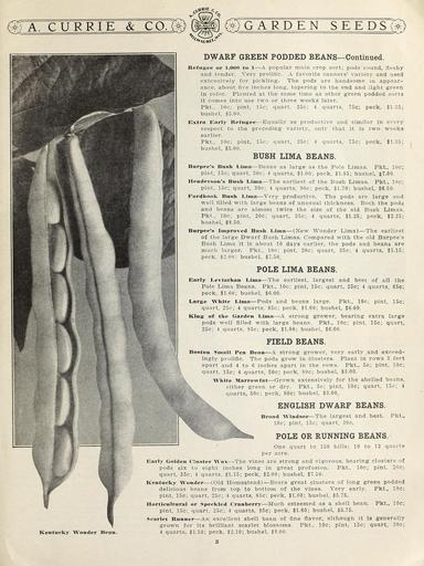 | Keywords: Garden and farm seeds (16252081637).jpg A CURRIE <br> GARDE N SEEPQ S <br> Kentucky Wonder Bean <br> DWARF GREEN PODDED BEANS Continued <br> Refugee or 1 000 to 1 A popular main crop sort; pods'round fleshy <br> and tender Very prolific A favorite canners' variety and used <br> extensively for pickling- The pods are handsome in appear- <br> ance about five inches long tapering to the end and light green <br> in color Planted at the same time as other green podded sorts <br> it comes into use two or three weeks later <br> Pkt 10c; pint 15c; quart 25c; 4 quarts 75c; peck 1 35; <br> bushel 5 00 <br> Extra Early Refugee Equally as productive and similar in every <br> respect to the preceding variety only that it is two weeks <br> earlier <br> Pkt 10c; pint 15c; quart 25c; 4 quarts 75c; peck 1 35; <br> bushel 5 00 <br> BUSH LIMA BEANS <br> Burpee's Bush Lima Beans as large as the Pole Limas Pkt 10c; <br> pint 15c; quart 30c; 4 quarts 1 00; peck 1 85; bushel 7 00 <br> Henderson's Bush Lima The earliest of the Bush Limas Pkt 10c; <br> pint 15c; quart 30c; 4 quarts; 90c; peck 1 70; bushel 6 50 <br> Fordhook Bush Lima Very productive The pods are large and <br> well filled with large beans of unusual thickness Both the pods <br> and beans are almost twice the size of the old Bush Limas <br> Pkt 10c; pint 20c; quart 35c; 4 quarts 1 25; peck 2 25; <br> bushel 8 50 <br> Burpee's Improved Bush Lima New Wonder Lima - The earliest <br> of the large Dwarf Bush Limas Compared with the old Burpee's <br> Bush Lima it is about 10 days earlier the pods and beans are <br> much larger Pkt 10c; pint 20c; quart 35c; 4 quarts 1 15; <br> peck 2 00; bushel 7 50 <br> POLE LIMA BEANS <br> Early Leviathan Lima The earliest largest and best of all the <br> Pole Lima Beans Pkt 10c; pint 15c; quart 25c; 4 quarts 85c; <br> peck 1 60; bushel 6 00 <br> Large White Lima Pods and beans large Pkt 10c; pint 15c; <br> quart 25c; 4 quarts 85c; peck 1 60; bushel 6 00 <br> King of the Garden Lima A strong grower bearing extra large <br> pods well filled with large beans Pkt 10c; pint 15c; quart <br> 25c; 4 quarts 85c; peck 1 60; bushel 6 00 <br> FIELD BEANS <br> Boston Small Pea Bean A strong grower very early and exceed- <br> ingly prolific The pods grow in clusters Plant in rows 3 feet <br> apart and 4 to 6 inches apart in the rows Pkt 5c; pint 10c; <br> quart 15c; 4 quarts 50c; peck 80c; bushel 3 00 <br> White Marrowfat Grown extensively for the shelled beans <br> either green or dry Pkt 5c; pint 10c; quart 15c; 4 <br> quarts 50c; peck 80c; bushel 3 00 <br> ENGLISH DWARF BEANS <br> Broad Windsor The largest and best Pkt <br> 10c; pint 15c; quart 30c <br> POLE OR RUNNING BEANS <br> One quart to 150 hills; 10 to 12 quarts <br> per acre <br> Early Golden Cluster Wax The vines are strong and vigorous bearing clusters of <br> pods six to eight inches long in great profusion Pkt 10c; pint 20c; <br> quart 35c; 4 quarts 1 15; peck 2 00; bushel 7 50 <br> Kentucky Wonder Old Homestead Bears great clusters of long green podded <br> delicious beans from top to bottom of the vines Very early Pkt 10c; <br> pint 15c; quart 25c; 4 quarts 85c; peck 1 60; bushel 5 75 <br> Horticultural or Speckled Cranberry Much esteemed as a shell bean Pkt 10c; <br> pint 15c; quart 25c; 4 quarts 85c; peck 1 60; bushel 5 75 <br> Scarlet Runner An excellent shell bean of fine flavor although it is generally <br> grown for its brilliant scarlet blossoms Pkt 10c; pint 15c; quart 30c; <br> 4 quarts 1 10; peck 2 10; bushel 8 00 42156421 132760 65915 Page 3 Text http //www biodiversitylibrary org/page/42156421 1913 10 5962/bhl title 65915 A Currie Company ; Henry G Gilbert Nursery and Seed Trade Catalog Collection NameFound Limas NameConfirmed Limas NameBankID 4220815 Biodiversity Heritage Library Garden and farm seeds spring 1913 um Garden Stories Bulbs Plants Catalogs Equipment and supplies Flowers Gardening Nurseries Horticulture Plants Ornamental Seeds Vegetables U S Department of Agriculture National Agricultural Library bhl page 42156421 dc identifier http //biodiversitylibrary org/page/42156421 bhlGardenStories Beans A Currie Co BHLinbloom bulbs plants nurseries horticulture plants ornamental u s department of agriculture national agricultural library bhlgardenstories a currie co bhlinbloom Information field Flickr posted date ISOdate 2015-02-03 Check categories 2015 August 25 CC-BY-2 0 BioDivLibrary https //flickr com/photos/61021753 N02/16252081637 2015-08-25 01 54 33 cc-by-2 0 PD-old-70-1923 Beans Garden and farm seeds 1913 Photos uploaded from Flickr by FĂŚ using a script |