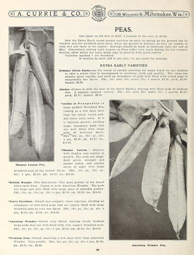 | Keywords: Garden and farm seeds (16370940411).jpg A CURRIE CO m <br> 130 Wisconsin St Milwaukee Wis ££ <br> PEAS <br> Thomas Laxton Pea <br> wrinkled peas of the richest flavor Pkt 10c; pt 25c; qt <br> 60c; 4 qts 2 15; pk 4 00; bu 15 00 <br> ™¦British Wonder The Sherwood ” The most prolific of the dwarf <br> extra early Peas Comes in with American Wonder The pods <br> are large and well filled with large peas of splendid quality <br> Pkt 10c; pt 25c; qt 45c; 4 qts 1 50; pk 2 65; bu 10 00 <br> Nott's Excelsior ” Dwarf and compact; vines vigorous yielding an <br> abundance of well-filled pods that are closely filled with large <br> wrinkled peas of very fine flavor Pkt 10c; pt 25c; qt 45c; 4 <br> qts 1 50; pk 2 65; bu 10 00 <br> 'American Wonder ” Grows very dwarf bearing freely medium <br> large pods that are well-filled with rich sugary wrinkled peas <br> Pkt 10c; pt 25c; qt 45c; 4 qts 1 50; pk 2 65; bu 10 00 <br> Preniium Gem ” Dwarf maturing a few days later than American <br> Wonder Very prolific Pkt 10c; pt 25c; qt 40c; 4 qts 1 35; <br> pk 2 35; bu 9 00 <br> 20 <br> One quart to 200 feet of drill; 2 bushels to the acre in drills <br> Sow the Extra Early round seeded varieties as early in spring as the ground can be <br> worked and the – wrinkled sorts later when the ground is warmer as they rot readily in <br> cold wet soil early in the season Sowings should be made at intervals until the end of <br> May Discontinue sowing until August as Peas suffer very much during the hot summer <br> months after which the early kinds may be planted with good results <br> Varieties marked are wrinkled <br> If wanted by mail add 8c per pint 15c per quart for postage <br> EXTRA EARLY VARIETIES <br> Defiance Extra Early ” As the result of careful selection for many years we are enabled <br> to offer a strain that is unsurpassed in earliness yield and quality The vines are <br> slender grow rapidly and yield an abundance of pods well filled with round peas of <br> remarkably fine flavor Pkt 10c; pint 20c; quart 35c; 4 quarts 1 35; peck 2 50; <br> bushel 8 50 <br> Alaska ” Comes in with the best of the Extra Earlies bearing well filled pods of medium <br> size A popular canners' variety Pkt 10c; pint 20c; quart 35c; 4 quarts 1 25; <br> peck 2 15; bushel 8 00 <br> Gradus or Prosperit y ” A <br> large podded Wrinkled Pea <br> coming in a few days later <br> than the small round pod- <br> ded extra early sorts It is <br> a vigorous grower yielding <br> large handsome pods that <br> are well filled with large <br> peas of delicious flavor <br> Pkt~10cfpt 30c; qt 55c; <br> 4 qts 2 00; pk 3 85; bu <br> 15 00 <br> Thomas Laxton ” Matures <br> with Gradus and similar in <br> growth The pods are large <br> dark green straight and <br> square ended and contain <br> seven or eight very large <br> American Wonder Pea 42156472 132761 65916 Page 20 Text http //www biodiversitylibrary org/page/42156472 1912 10 5962/bhl title 65916 A Currie Company ; Henry G Gilbert Nursery and Seed Trade Catalog Collection NameFound Gradus NameConfirmed Gradus NameBankID 4460149 NameFound Preniium Biodiversity Heritage Library Garden and farm seeds spring 1912 Garden Stories Bulbs Plants Catalogs Equipment and supplies Flowers Gardening Nurseries Horticulture Plants Ornamental Seeds Vegetables U S Department of Agriculture National Agricultural Library bhl page 42156472 dc identifier http //biodiversitylibrary org/page/42156472 bhlGardenStories BHLinbloom bulbs plants nurseries horticulture plants ornamental u s department of agriculture national agricultural library bhlgardenstories bhlinbloom Information field Flickr posted date ISOdate 2015-01-26 Check categories 2015 August 25 CC-BY-2 0 BioDivLibrary https //flickr com/photos/61021753 N02/16370940411 2015-08-25 06 52 53 cc-by-2 0 PD-old-70-1923 Garden and farm seeds 1912 Photos uploaded from Flickr by Fæ using a script |