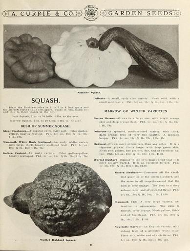| Keywords: Garden and farm seeds (16371789412).jpg 2l <br> A CURRI E CO gt O GARD EN SEE j <br> Summer Squash <br> SQUASH <br> Plant the Bush varieties in hills 5 to 6 feet apart and <br> the Marrow sorts 9 to 10 feet apart Plant in rich warm soil <br> and thin to three plants to the hill <br> Bush Squash 1 oz to 50 hills; 5 lbs to the acre <br> Marrow Squash 1 oz to 20 hills; 4 lbs to the acre <br> BUSH OR SUMMER SQUASH <br> Giant Crookneek A popular extra early sort Color golden- <br> yellow heavily warted Pkt 5c; oz 10c; lb 20c; <br> 1 lb 70c <br> Mammoth White Bush Scalloped An early white variety <br> with large thick heavily scalloped fruit Pkt 5c; oz <br> 10c; lb 20c; 1 lb 70c <br> Golden Custard An early variety Color golden-yellow <br> heavily scalloped Pkt 5c; oz 10c; lb 20c; 1 lb 70c <br> Delieata A small early vine variety Flesh solid with a <br> small seed cavity Pkt 5c; oz 10c; lb 25c; 1 lb 70c <br> MARROW OR WINTER VARIETIES <br> Boston Marrow Grows to a large size with bright orange <br> skin and deep orange flesh Pkt 5c; oz 10c; lb 20c; <br> 1 lb 70c <br> Delicious A splendid medium-sized variety with thick <br> dark orange flesh of very fine quality A splendid <br> keeper Pkt 5c; oz 10c; lb 25c; 1 lb 85c <br> Hubbard Grown more extensively than any other It is a <br> vigorous grower fruits large with deep green skin <br> Flesh rich golden fine grained dry and of excellent fla- <br> vor Pkt 5c; oz 10c; Yi lb 30c; 1 lb 1 00 <br> Warted Hubbard Similar to the preceding except that it is <br> more heavily warted It is an excellent keeper Pkt <br> 5c; oz 10c; lb 30c; 1 lb 1 00 <br> Golden Hubbard Possesses all the excel- <br> lent qualities of the Green Hubbard and <br> the same in all respects except that the <br> skin is deep orange The flesh is a deep <br> salmon color and of splendid flavor Pkt <br> 5c; oz 10c; lb 30c; 1 lb 1 00 <br> Mammoth Chili A very large variety at- <br> tractive in appearance The skin is <br> smooth color orange Flesh yellow thick <br> and of fine flavor Pkt 5c; oz 10c; <br> lb 30c; 1 lb 1 00 <br> Warted Hubbard Squash <br> Vegetable Marrow An English variety with <br> oblong fruit of a greenish white color <br> Flesh soft white and of rich flavor Pkt <br> 5c; oz 10c; lb 25c; 1 lb 75c <br> 27 42156479 132761 65916 Page 27 Text http //www biodiversitylibrary org/page/42156479 1912 10 5962/bhl title 65916 A Currie Company ; Henry G Gilbert Nursery and Seed Trade Catalog Collection Biodiversity Heritage Library Garden and farm seeds spring 1912 Garden Stories Bulbs Plants Catalogs Equipment and supplies Flowers Gardening Nurseries Horticulture Plants Ornamental Seeds Vegetables U S Department of Agriculture National Agricultural Library bhl page 42156479 dc identifier http //biodiversitylibrary org/page/42156479 bhlGardenStories BHLinbloom bulbs plants nurseries horticulture plants ornamental u s department of agriculture national agricultural library bhlgardenstories bhlinbloom Information field Flickr posted date ISOdate 2015-01-26 Check categories 2015 August 25 CC-BY-2 0 BioDivLibrary https //flickr com/photos/61021753 N02/16371789412 2015-08-25 06 54 30 cc-by-2 0 PD-old-70-1923 Garden and farm seeds 1912 Photos uploaded from Flickr by FĂŚ using a script |