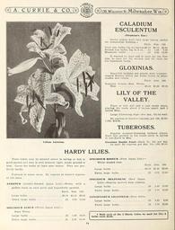 | Keywords: Garden and farm seeds (16371875002).jpg  m <br> A C U R R I E CO m yp 3UQ Wisconsin St Milwaukee Wis £i <br> I ilium Auratum <br> CALADIUM <br> ESCULENTUM <br> Elephant's Ear l <br> Showy plants with very large leaves useful <br> for ornamental bedding- » <br> Each Doz 100 <br> First size bulbs 1 to 2 inches 0 10 0 75 5 00 <br> Second size bulbs 2 to 3 in 12 1 00 7 00 <br> Mammoth bulbs 20 2 00 12 00 <br> If wanted by mail add 3c each for the first <br> size 5c each for the second and 10c each for <br> the mammoth bulbs <br> GLOXINIAS <br> Beautiful bulbous pot plants with trumpet- <br> shaped flowers which ar e borne freely in many <br> shades and colors <br> Each Doz 100 <br> Separate Colors ” Red White <br> Blue 0 10 1 00 7 00 <br> LILY OF THE <br> VALLEY <br> Plant in rich soil and a cool shady place <br> placing the roots about 6 inches apart and 2 <br> inches deep <br> Large Flowering Pips ” Per doz 35c by mail <br> By express at buyer's expense per 100 2 00; <br> 1 000 16 00 <br> TUBEROSES <br> Popular summer-blooming bulbous plants <br> Start into growth in the house early in spring <br> or out-doors in May <br> Excelsior Double Pearl ” Each 5c; 50c per doz <br> by mail By express per doz 35c; 100 2 50 <br> HARDY LILIES <br> These Lilies may be planted either in spring or fall in <br> good garden soil that is well drained; light sandy ground is <br> best Cover the bulbs at least nine inches They are per- <br> fectly hardy <br> Postpaid at dozen rates By express at buyer's expense <br> at 100 rates <br> AURATUM Golden-Banded Japan Lily ” White with a <br> golden band on each petal and beautifully spotted <br> Each Doz 100 <br> Large bulbs 0 20 1 25 8 00 <br> Extra large bulbs 25 2 00 12 00 <br> SPECIOSUM ALBUM White Japan Lily ” <br> Pure White <br> Large bulbs 20 1 50 10 00 <br> Extra large bulbs 25 2 00 14 00 <br> SPECIOSUM ROSEUM Pink Japan Lily ” <br> White shaded rose <br> Each Doz 100 <br> Large bulbs 0 20 1 25 8 00 <br> Extra large bulbs 25 1 75 12 00 <br> SPECIOSUM MELPOMENE Red Japan <br> Lily ” Heavily spotted deep crimson <br> Large bulbs 20 1 50 10 00 <br> Extra large bulbs 25 1 75 12 00 <br> LONGIFLORUM CIGANTEIIM ” Pure white <br> Large bulbs 15 1 25 9 00 <br> Extra large bulbs 25 1 75 12 00 <br> 1 Bnlb each of the 5 Hardy Lilies by mail for 75c; 3 <br> bulbs each 2 00 <br> 74 42156526 132761 65916 Page 74 Text http //www biodiversitylibrary org/page/42156526 1912 10 5962/bhl title 65916 A Currie Company ; Henry G Gilbert Nursery and Seed Trade Catalog Collection NameFound Auratum NameFound Caladium esculentum NameConfirmed Caladium esculentum L Vent EOLID 1091931 NameBankID 5875357 Biodiversity Heritage Library Garden and farm seeds spring 1912 Garden Stories Bulbs Plants Catalogs Equipment and supplies Flowers Gardening Nurseries Horticulture Plants Ornamental Seeds Vegetables U S Department of Agriculture National Agricultural Library bhl page 42156526 dc identifier http //biodiversitylibrary org/page/42156526 bhlGardenStories BHLinbloom bulbs plants nurseries horticulture plants ornamental u s department of agriculture national agricultural library bhlgardenstories bhlinbloom Information field Flickr posted date ISOdate 2015-01-26 Check categories 2015 August 25 CC-BY-2 0 BioDivLibrary https //flickr com/photos/61021753 N02/16371875002 2015-08-25 06 52 23 cc-by-2 0 PD-old-70-1923 Garden and farm seeds 1912 Photos uploaded from Flickr by Fæ using a script |
