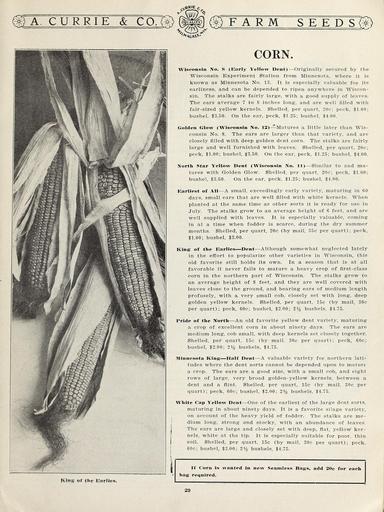 | Keywords: Garden and farm seeds (16437992125).jpg c l£s- <br> A CURRIE C0 <br> FARM SEEDSi <br> CORN <br> Wisconsin No 8 Early Yellow Dent ” Originally secured by the <br> Wisconsin Experiment Station from Minnesota where it is <br> known as Minnesota No 13 It is especially valuable for its <br> earliness and can be depended to ripen anywhere in Wiscon- <br> sin The stalks are fairly large with a good supply of leaves <br> The ears average 7 to S inches long and are well filled with <br> fair-sized yellow kernels Shelled per quart 20c; peck 1 00; <br> bushel 3 50 On the ear peck 1 25; bushel 4 00 <br> Golden Glow Wisconsin No 12 ” Matures a little later than Wis- <br> consin No 8 The ears are larger than that variety and are <br> closely filled with deep golden dent corn The stalks are fairly <br> large and well furnished with leaves Shelled per quart 20c; <br> peck 1 00; bushel 3 50 On the ear peck 1 25; bushel 4 00 <br> North Star Yellow Dent Wisconsin No 11 ” Similar to and ma- <br> tures with Golden Glow Shelled per quart 20c; peck 1 00; <br> bushel 3 50 On the ear peck 1 25; bushel 4 00 <br> Earliest of All ” A small exceedingly early variety maturing in 60 <br> days small ears that are well filled with white kernels When <br> planted at the same time as other sorts it is ready for use in <br> July The stalks grow to an average height of 6 feet and are <br> well supplied with leaves It is especially valuable coming <br> in at a time when fodder is scarce during the dry summer <br> months Shelled per quart 20c by mail 35c per quart ; peck <br> 1 00; bushel 3 00 <br> King of the Earlies ” Dent ” Although somewhat neglected lately <br> in the effort to popularize other varieties in Wisconsin this <br> old favorite still holds its own In a season that is at all <br> favorable it never fails to mature a heavy crop of first-class <br> corn in the northern part of Wisconsin The stalks grow to <br> an average height of 8 feet and they are well covered with <br> leaves close to the ground and bearing ears of medium length <br> profusely with a very small cob closely set with long deep <br> golden yellow kernels Shelled per quart 15c by mail 30c <br> per quart ; peck 60c; bushel 2 00; 2 bushels 4 75 <br> Pride of the North ” An old favorite yellow dent variety maturing <br> a crop of excellent corn in about ninety days The ears are <br> medium long cob small with deep kernels set closely together <br> Shelled per quart 15c by mail 30c per quart ; peck 60c; <br> bushel 2 00; 2 bushels 4 75 <br> Minnesota King ” Half Dent ” A valuable variety for northern lati- <br> tudes where the dent sorts cannot be depended upon to maturr <br> a crop The ears are a good size with a small cob and eight <br> rows of large very broad golden-yellow kernels between a <br> dent and a flint Shelled per quart 15c by mail 30c per <br> quart ; peck 60c; bushel 2 00; 2 bushels 4 75 <br> Wliite Cap Yellow Dent ” One of the earliest of the large dent sorts <br> maturing in about ninety days It is a favorite silage variety <br> on account of the heavy yield of fodder The stalks are me- <br> dium long strong and stocky with an abundance of leaves <br> The ears are large and closely set with deep flat yellow' ker- <br> nels white at the tip It is especially suitable for poor thin <br> soil Shelled per quart 15c by mail 30c per quart ; peck <br> 60c; bushel 2 00; 2V 2 bushels 4 75 <br> King of the Earlies <br> If Corn is wanted in new Seamless Bags add 20c for each <br> bag; required <br> 20 42156395 132760 65915 Page 29 Text http //www biodiversitylibrary org/page/42156395 1913 10 5962/bhl title 65915 A Currie Company ; Henry G Gilbert Nursery and Seed Trade Catalog Collection Biodiversity Heritage Library Garden and farm seeds spring 1913 um Garden Stories Bulbs Plants Catalogs Equipment and supplies Flowers Gardening Nurseries Horticulture Plants Ornamental Seeds Vegetables U S Department of Agriculture National Agricultural Library bhl page 42156395 dc identifier http //biodiversitylibrary org/page/42156395 bhlGardenStories Corn A Currie Co BHLinbloom bulbs plants nurseries horticulture plants ornamental u s department of agriculture national agricultural library bhlgardenstories a currie co bhlinbloom Information field Flickr posted date ISOdate 2015-02-03 Check categories 2015 August 25 CC-BY-2 0 BioDivLibrary https //flickr com/photos/61021753 N02/16437992125 2015-08-25 01 53 05 cc-by-2 0 PD-old-70-1923 Garden and farm seeds 1913 Photos uploaded from Flickr by Fæ using a script |