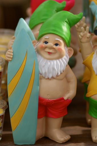 Keywords: garden gnome colorful oblique dwarf flashy turquoise green yellow crazy summer garden swim surf