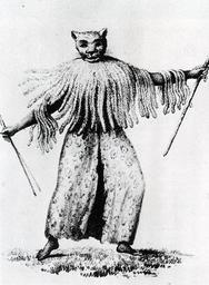 | Keywords: Gardiner - Dingane se lofsanger (1836).png  Dingane's praise singer as seen and depicted by Allen Francis Gardiner The singer appeared at the end of each dance Gardiner described him as such Enveloped in the skin of a panther he bore no resemblance to a human being Stamme Ryke deur J S Bergh in samewerking met A P Bergh Don Nelson Kaapstad 1984 1836 in Narrative of a Journey to the Zoolu Country in South Africa undertaken in 1835 1836 Allen Francis Gardiner Public domain due to its age PD-Old Kingdom of Zulu Leopard clothing in art 1836 in South Africa |