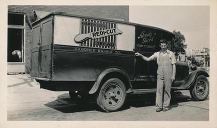 | Keywords: Gardner Baking Company Delivery Truck 1931 Source: O'Dea Family Archive Date: 1931 A man stands next to a Gardner's Bakery delivery truck, which is parked in front of Plaenert's Grocery Store at 1128 S. Park St. The sign on the truck advertises a recent innovation, their Redi-Cut pre-sliced bread. Large signs for the Texaco Gas Station down the street can be seen on the right side of the picture. Gardner Baking Company Delivery Truck 1931 Source: O'Dea Family Archive Date: 1931 A man stands next to a Gardner's Bakery delivery truck, which is parked in front of Plaenert's Grocery Store at 1128 S. Park St. The sign on the truck advertises a recent innovation, their Redi-Cut pre-sliced bread. Large signs for the Texaco Gas Station down the street can be seen on the right side of the picture. |