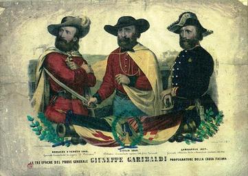 Keywords: Garibaldi divise.jpg en popular print showing Garibaldi wearing uniforms of 1848 1859 and 1860 wars it Stamapa popolare dell'epoca che mostra Garibaldi con le divise di comandante di cacciatori delle Alpi 1859 spedizioen dei Mille 1860 e dei volontari 1848 popular print od that time Author ~ 1861 Giuseppe Garibaldi Italian Risorgimento wars PD-old |