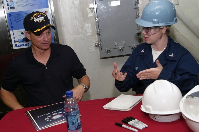 Keywords: Gary Sinise on USS Ronald Reagan 2.jpg en Actor Gary Sinise listens to a question from Petty Officer 3rd Class Cara Maib during an interview on the mess decks of Nimitz-class aircraft carrier USS Ronald Reagan CVN 76 June 25 Organized through the United Service Organization USO Sinise toured and met with the crew of Ronald Reagan Reagan is in her homeport of San Diego following a three-month deployment to the Western Pacific http //www dvidshub net/index php script images/images_gallery php action viewimage fid 53336 Petty Officer 3rd Class Joe Painter 2007-06-25 PD-USGov-Military-Navy Gary Sinise Guests aboard USS Ronald Reagan CVN-76 Mess decks of USS Ronald Reagan CVN-76 |