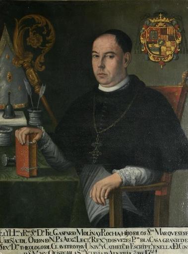 | Keywords: Gaspar de Molina y Rocha, obispo de Almería (Universidad de Sevilla).jpg Gaspar de Molina y Rocha 1700-1760 que fue obispo de Almeria entre 1741 y 1760 era hijo de los marqueses de Ureña y aparece vestido de eclesiástico y sentado junto a un mesa junto a la que hay una mitra y un báculo aunque la mano derecha del prelado descansa sobre un libro c 1835 oil canvas Size cm 80 107 Institution Universidad de Sevilla http //www patrimonioartistico us es/objeto jsp id 686 tipo v elto 5 buscando true repetir true object history exhibition history credit line En el anverso aparece la siguiente inscripción «El Yllmo y Rmo Sor Dn Fr Gaspar de Molina y Rocha; hijo de los sres marqueses de / Ureña del Orden de N P S Augn Lectr Rexte y dos vezes Por de la Casa Grande de / Seva Dor Theólogo del Claustro de su Univd y Cathedco de Escripta En ella de consq / de S M y su ovispo de la Sta Yglesia de Almería A de 1741 » accession number 0684-00-REC-PINT http //www patrimonioartistico us es/objeto jsp id 686 tipo v elto 5 buscando true repetir true PD-old-100 Uploaded with UploadWizard Gaspar de Molina y Rocha Colección Retratos de Universitarios Ilustres Universidad de Sevilla José María Arango |