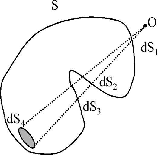 Keywords: GAUSS3.png A complex external surface seen from an external point 2007-04-10 own assumed Pasquale Carelli Surfaces Electrostatics Gauss' Law Carl Friedrich Gauß