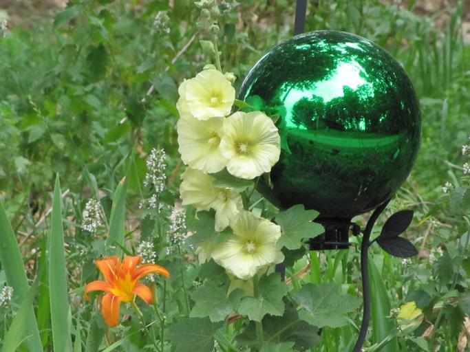 gazing_ball,_orange_daylily,_holly_hock.jpg (1600x1200)