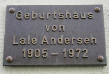 | Keywords: Gedenktafel Lale Andersen.jpg  Gedenktafel an Lale Andersens Geburtshaus in Bremerhaven-Lehe Lutherstraße 3 Memorial tablet for the German singer Lale Andersen at her birthplace in Bremerhaven Lutherstraße 3 Plaque commémorative sur la maison natale de la chanteuse allemande Lale Andersen à Bremerhaven Placa conmemorativa que recuerda a la cantante alemana Lale Andersen en su casa natal Minnestavla på Lale Andersens födelsehus i Bremerhaven Lutherstraße 3 Own 2006-11-04 Garitzko Lale_Andersen Plaques in Bremerhaven Lehe Bremerhaven Here-was-born plaques in Germany |
