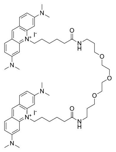| Keywords: GelGreen chemical structure.png Chemical structure of GelGreen a DNA staining dye for gel electrophoresis own original text Selfmade 1 2012-11-20 Cacycle GFDL-self-no-disclaimers review Comments High-resolution black/white PNG made with ChemDraw and IrfanView ” see WikiProject Chemistry - structure drawing for detailed instructions Please drop me a note if you need the source file Structure taken from patent http //worldwide espacenet com/searchResults compact false ST number locale en_EP DB EPODOC NUM US20100323453 US20100323453 where it is referred to as Dye No 20 and AOAO-13 The compound was identified by comparison of the gel image in Fig 8 C with the identical image in this http //www biotium com/product/product_info/flyer/GelRed 20 20GelGreen 20Flyer pdf product info Acridines Dyes Images created or edited with IrfanView |