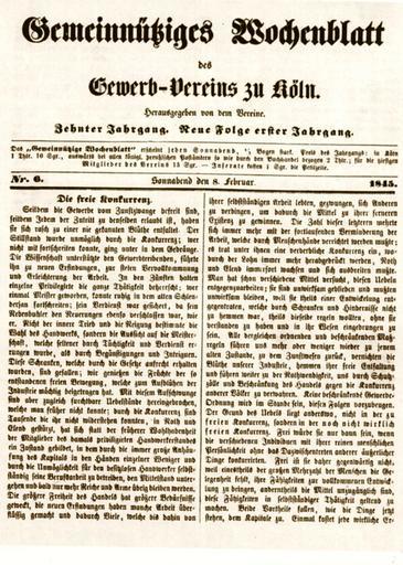 Keywords: GemeinnützigesWochenblatt.jpg Titelblatt Gemeinnütziges Wochenblatt des Gewerbevereins zu Köln 1845 own scan 2007-08-29 Machahn 15 11 29 August 2007 UTC PD-old Periodicals of Germany Gemeinnütziges Wochenblatt