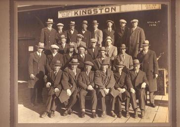 | Keywords: 1930s men railways stations cnr station cnrstation hats clothes kingston, ontario kingstonontario Photograph of a group of men at the Canadian National Railway station in Kingston, Ontario on April 21st, 1932. On the back is a note reading "Mr J. Slater, Gananoque, RR3, Photo 10". We have no information about this group or its members. The photograph was donated to the Archives by Steve Lindsay. Photograph of a group of men at the Canadian National Railway station in Kingston, Ontario on April 21st, 1932. On the back is a note reading "Mr J. Slater, Gananoque, RR3, Photo 10". We have no information about this group or its members. The photograph was donated to the Archives by Steve Lindsay. |