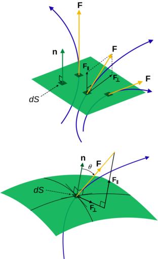 Keywords: General flux diagram.svg en General flux diagram any flux F any curved surface n is unit normal to surface dS is differential surface element 2012-09-11 01 52 12 own Maschen cc-zero Surfaces Vectors