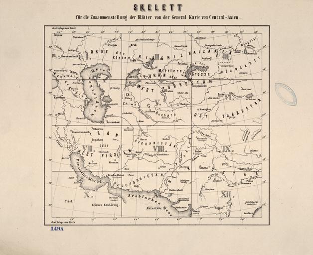 | Keywords: General Map of Central Asia- Schematic View WDL11786.png Artwork ru Авст о-Венге ская мона хия Militärgeographisches Institut fr Monarchie austro-hongroise Militärgeographisches Institut en Austro-Hungarian Monarchy Militärgeographisches Institut zh 奥匈 国 军事 理研究 pt Monarquia austro-húngara Militärgeographisches Institut ar المملكة النمساوية-المجرية المعهد الجغرافي العسكري es Monarquía austrohúngara Militärgeographisches Institut ru Общая ка та Цент альной Азии схематический вид fr Carte générale de l'Asie centrale vue schématique en General Map of Central Asia Schematic View zh 中亚 图:概览图 pt Mapa geral da Ásia Central Visão Esquemática ar خريطة عامة لآسيا الوسطى رؤية تخطيطية ru <em> General-Karte von Central-Asien </em> Общая ка та Цент альной Азии п едставляет собой большую под обную ка ту выпущенную в 1874 г Военным геог афическим институтом в Вене Ка та занимает 12 отдельных листов п онуме ованных от I до XII; на 13-м листе п едоставлена общая инфо мация и уководство с нуме ацией для соединения частей Ка та охватывает обши ный егион на севе о-западе он г аничит с те ито ией России к севе у от Каспийского мо я; на юго-западе с те ито ией сов еменной Саудовской А авии и Омана на севе о-востоке с Западной онголией а на юго-востоке с п овинцией Гуджа ат Индия азвание ключ к символам и пояснения к сок ащениям п иводятся на Листе X в левом нижнем углу юго-запад асштаб указан в семи азличных единицах изме ения английских итальянских усских ту ецких пе сидских китайских и мет ических в нижней части Листа XII В число объектов на ка те входят большие и малые го ода; г аницы госуда ств и п овинций; башни к епости и уины; существующие и п оекти уемые железные до оги; телег афные линии и до оги Из названия следует что ка та была пе есмот ена с учетом лучших и новейших оссийских и английских источников Российская и Б итанская импе ии сопе ничали за установление влияния в Цент альной Азии вели так называемую Большую иг у Они очень хо ошо знали егион благода я данным полученным в ходе научных и военных экспедиций а также в езультате комме ческих контактов <br>А авийский залив; А авийский полуост ов; Балканский полуост ов; Пе сидский залив fr La <em>General-Karte von Central-Asien</em> Carte générale de l'Asie centrale est une grande carte détaillée réalisée en 1874 par l'Institut géographique militaire de Vienne Elle est composée de 12 planches distinctes numérotées de I à XII et d'une treizième planche contenant une vue générale et un guide numéroté permettant d'assembler la carte La carte couvre une vaste étendue délimitée au nord-ouest par la région de la Russie au nord de la mer Caspienne au sud-ouest par les actuels Arabie saoudite et Sultanat d'Oman au nord-est par la Mongolie occidentale et au sud-est par le Gujarat en Inde La plaque X située dans l'angle inférieur gauche sud-ouest contient le titre la légende des symboles et l'explication des abréviations Au bas de la plaque XII sept échelles sont fournies avec différentes unités de distance anglaise italienne russe turque perse chinoise et métrique La carte indique les villes et les villages les frontières nationales et provinciales les tours les forteresses et les vestiges les chemins de fer existants et en projet les lignes télégraphiques et les routes Selon le titre elle fut « révisée avec les meilleures et les plus récentes sources russes et anglaises » La Russie et l'Empire britannique se disputèrent le contrôle de l'Asie centrale dans une lutte d'influence appelée par la suite « le grand jeu » Ces deux puissances possédaient une expertise particulière de la région qu'elles devaient à leurs expéditions scientifiques et militaires ainsi qu'à leurs relations commerciales <br>Golfe Arabique; Péninsule arabique; Péninsule balkanique; Golfe Persique en <em>General-Karte von Central-Asien</em> General map of Central Asia is a large detailed map produced in 1874 by the Military Geographic Institute of Vienna The map is on 12 separate plates numbered I XII; a 13th plate gives an overview and a numbered guide to how the parts fit together The map covers a huge expanse bounded to the northwest by the region of Russia north of the Caspian Sea; to the southwest by present-day Saudi Arabia and Oman; to the northeast by western Mongolia; and to the southeast by Gujarat India The title key to symbols and explanation of abbreviations are on Plate X in the lower left-hand southwestern corner Seven scales in different distance units English Italian Russian Turkish Persian Chinese and metric are provided at the bottom of Plate XII The features shown include cities and towns; national and provincial borders; to