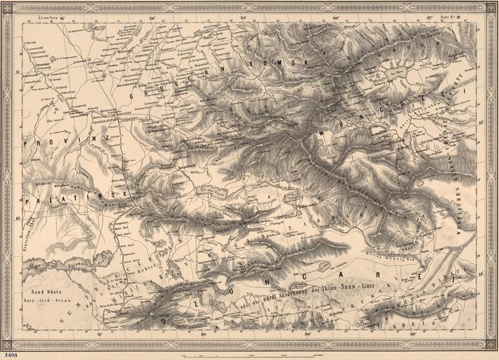 Keywords: General Map of Central Asia - Plate 3 (1874).jpg Kurztitel General-Karte von Central-Asien; Vollständiger Titel General-Karte von Central-Asien bearbeitet nach den besten und neuesten Russischen und Englischen quellen <br />General-Karte von Central-Asien III platte Maßstab 1 3 024 000; Maße 125 x 137 cm <br /> General Karte von Central Asien ist eine große detaillierte Karte im Jahre 1874 von der Militär Geographischen Institut Wien produziert Die Karte ist auf 12 getrennten Platten nummeriert I-XII; ein 13 Platte gibt einen berblick und eine nummerierte Anleitung wie die Teile zusammenpassen Die Karte deckt eine riesige Fläche im Nordwesten von der russischen Region nördlich des Kaspischen Meeres begrenzt ist; im Südwesten von heutigen Saudi-Arabien und Oman; nordöstlich von der westlichen Mongolei; und im Südosten von Gujarat Indien Der Titel Zeichenerklärung und Erklärung der Abkürzungen sind auf Tafel X in der unteren linken südwestlichen Ecke Sieben Schuppen in verschiedenen Längeneinheiten Englisch Italienisch Russisch Türkisch Persisch Chinesisch und metrischen vorgesehen sind an der Unterseite der Platte XII Die gezeigten Merkmale sind Städte und Gemeinden; nationalen und provinziellen Grenzen; Türme Burgen und Ruinen; bestehende und geplante Eisenbahnstrecken; Telegrafenleitungen; und Straßen Nach dem Titel wird die Karte mit den besten und neuesten russischen und englischen Quellen überarbeitet Russland und die British Empire waren Rivalen um Einfluss in Zentralasien in was später als The Great Game und sie spezielles Know-how hatten über die Region gewonnenen wissenschaftlichen und militärischen Expeditionen und Handelskontakte Short Title General Map of Central Asia; Full Title General map of Central Asia edited based on the best and the newest Russian and English sources <br />General map of Central Asia III plate Scale 1 3 024 000; Dimension 125 × 137 cm <br /> General map of Central Asia is a large detailed map produced in 1874 by the Military Geographic Institute of Vienna The map is on 12 separate plates numbered I XII; a 13th plate gives an overview and a numbered guide to how the parts fit together The map covers a huge expanse bounded to the northwest by the region of Russia north of the Caspian Sea; to the southwest by present-day Saudi Arabia and Oman; to the northeast by western Mongolia; and to the southeast by Gujarat India The title key to symbols and explanation of abbreviations are on Plate X in the lower left-hand southwestern corner Seven scales in different distance units English Italian Russian Turkish Persian Chinese and metric are provided at the bottom of Plate XII The features shown include cities and towns; national and provincial borders; towers fortresses and ruins; existing and projected railroads; telegraph lines; and roads According to the title the map is revised with the best and newest Russian and English sources Russia and the British Empire were rivals for influence in Central Asia in what came to be called the Great Game and they had special expertise about the region gained from scientific and military expeditions and commercial contacts К аткое название Общая ка та Цент альной Азии; Полное название Общая ка та Цент альной Азии от едакти ованная с учетом лучших и новейших оссийских и английских источников <br />Общая ка та Цент альной Азии III лист асштаб 1 3 024 000; Разме ы 125 × 137 см <br /> Общая ка та Цент альной Азии п едставляет собой большую под обную ка ту выпущенную в 1874 г Военным геог афическим институтом в Вене Ка та занимает 12 отдельных листов п онуме ованных от I до XII; на 13-м листе п едоставлена общая инфо мация и уководство с нуме ацией для соединения частей Ка та охватывает обши ный егион на севе о-западе он г аничит с те ито ией России к севе у от Каспийского мо я; на юго-западе с те ито ией сов еменной Саудовской А авии и Омана на севе о-востоке с Западной онголией а на юго-востоке с п овинцией Гуджа ат Индия азвание ключ к символам и пояснения к сок ащениям п иводятся на Листе X в левом нижнем углу юго-запад асштаб указан в семи азличных единицах изме ения английских итальянских усских ту ецких пе сидских китайских и мет ических в нижней части Листа XII В число объектов на ка те входят большие и малые го ода; г аницы госуда ств и п овинций; башни к епости и уины; существующие и п оекти уемые железные до оги; телег афные линии и до оги Из названия следует что ка та была пе есмот ена с учетом лучших и новейших оссийских и английских источников Российская и Б итанская импе ии сопе ничали за установление влияния в Цент альной Азии вели так называемую Большую иг у Они очень хо ошо знали егион благода я данным полученным в ходе научных и военных экспедиций а также в езультат