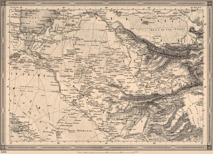 Keywords: General Map of Central Asia - Plate 5 (1874).jpg Kurztitel General-Karte von Central-Asien; Vollständiger Titel General-Karte von Central-Asien bearbeitet nach den besten und neuesten Russischen und Englischen quellen <br />General-Karte von Central-Asien V platte Maßstab 1 3 024 000; Maße 125 x 137 cm <br /> General Karte von Central Asien ist eine große detaillierte Karte im Jahre 1874 von der Militär Geographischen Institut Wien produziert Die Karte ist auf 12 getrennten Platten nummeriert I-XII; ein 13 Platte gibt einen berblick und eine nummerierte Anleitung wie die Teile zusammenpassen Die Karte deckt eine riesige Fläche im Nordwesten von der russischen Region nördlich des Kaspischen Meeres begrenzt ist; im Südwesten von heutigen Saudi-Arabien und Oman; nordöstlich von der westlichen Mongolei; und im Südosten von Gujarat Indien Der Titel Zeichenerklärung und Erklärung der Abkürzungen sind auf Tafel X in der unteren linken südwestlichen Ecke Sieben Schuppen in verschiedenen Längeneinheiten Englisch Italienisch Russisch Türkisch Persisch Chinesisch und metrischen vorgesehen sind an der Unterseite der Platte XII Die gezeigten Merkmale sind Städte und Gemeinden; nationalen und provinziellen Grenzen; Türme Burgen und Ruinen; bestehende und geplante Eisenbahnstrecken; Telegrafenleitungen; und Straßen Nach dem Titel wird die Karte mit den besten und neuesten russischen und englischen Quellen überarbeitet Russland und die British Empire waren Rivalen um Einfluss in Zentralasien in was später als The Great Game und sie spezielles Know-how hatten über die Region gewonnenen wissenschaftlichen und militärischen Expeditionen und Handelskontakte Short Title General Map of Central Asia; Full Title General map of Central Asia edited based on the best and the newest Russian and English sources <br />General map of Central Asia V plate Scale 1 3 024 000; Dimension 125 × 137 cm <br /> General map of Central Asia is a large detailed map produced in 1874 by the Military Geographic Institute of Vienna The map is on 12 separate plates numbered I XII; a 13th plate gives an overview and a numbered guide to how the parts fit together The map covers a huge expanse bounded to the northwest by the region of Russia north of the Caspian Sea; to the southwest by present-day Saudi Arabia and Oman; to the northeast by western Mongolia; and to the southeast by Gujarat India The title key to symbols and explanation of abbreviations are on Plate X in the lower left-hand southwestern corner Seven scales in different distance units English Italian Russian Turkish Persian Chinese and metric are provided at the bottom of Plate XII The features shown include cities and towns; national and provincial borders; towers fortresses and ruins; existing and projected railroads; telegraph lines; and roads According to the title the map is revised with the best and newest Russian and English sources Russia and the British Empire were rivals for influence in Central Asia in what came to be called the Great Game and they had special expertise about the region gained from scientific and military expeditions and commercial contacts К аткое название Общая ка та Цент альной Азии; Полное название Общая ка та Цент альной Азии от едакти ованная с учетом лучших и новейших оссийских и английских источников <br />Общая ка та Цент альной Азии V лист асштаб 1 3 024 000; Разме ы 125 × 137 см <br /> Общая ка та Цент альной Азии п едставляет собой большую под обную ка ту выпущенную в 1874 г Военным геог афическим институтом в Вене Ка та занимает 12 отдельных листов п онуме ованных от I до XII; на 13-м листе п едоставлена общая инфо мация и уководство с нуме ацией для соединения частей Ка та охватывает обши ный егион на севе о-западе он г аничит с те ито ией России к севе у от Каспийского мо я; на юго-западе с те ито ией сов еменной Саудовской А авии и Омана на севе о-востоке с Западной онголией а на юго-востоке с п овинцией Гуджа ат Индия азвание ключ к символам и пояснения к сок ащениям п иводятся на Листе X в левом нижнем углу юго-запад асштаб указан в семи азличных единицах изме ения английских итальянских усских ту ецких пе сидских китайских и мет ических в нижней части Листа XII В число объектов на ка те входят большие и малые го ода; г аницы госуда ств и п овинций; башни к епости и уины; существующие и п оекти уемые железные до оги; телег афные линии и до оги Из названия следует что ка та была пе есмот ена с учетом лучших и новейших оссийских и английских источников Российская и Б итанская импе ии сопе ничали за установление влияния в Цент альной Азии вели так называемую Большую иг у Они очень хо ошо знали егион благода я данным полученным в ходе научных и военных экспедиций а также в езультате ко