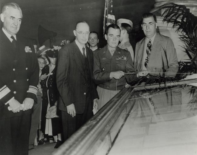 | Keywords: united states national archives personnel unitedstatesnationalarchivespersonnel nara:arcid=4477175 germany germany surrender germanysurrender world war ii worldwarii u.s. national archives usnationalarchives b/w bw Original Caption: General McAuliffe unveiling the German Surrender Documents in the Rotunda of the National Archives, June 6, 1945. U.S. National Archives’ Local Identifier: 64-NA-426 Subjects: United States National Archives Personnel Persistent URL: catalog.archives.gov/id/4477175 Repository: Still Picture Records Section, Special Media Archives Services Division (NWCS-S), National Archives at College Park, 8601 Adelphi Road, College Park, MD, 20740-6001. For information about ordering reproductions of photographs held by the Still Picture Unit, visit: www.archives.gov/research/order/still-pictures.html Reproductions may be ordered via an independent vendor. NARA maintains a list of vendors at www.archives.gov/research/order/vendors-photos-maps-dc.html Access Restrictions: Unrestricted Use Restrictions: Unrestricted Original Caption: General McAuliffe unveiling the German Surrender Documents in the Rotunda of the National Archives, June 6, 1945. U.S. National Archives’ Local Identifier: 64-NA-426 Subjects: United States National Archives Personnel Persistent URL: catalog.archives.gov/id/4477175 Repository: Still Picture Records Section, Special Media Archives Services Division (NWCS-S), National Archives at College Park, 8601 Adelphi Road, College Park, MD, 20740-6001. For information about ordering reproductions of photographs held by the Still Picture Unit, visit: www.archives.gov/research/order/still-pictures.html Reproductions may be ordered via an independent vendor. NARA maintains a list of vendors at www.archives.gov/research/order/vendors-photos-maps-dc.html Access Restrictions: Unrestricted Use Restrictions: Unrestricted |