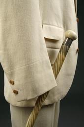 Keywords: Gentlemannen - om män och mode - Hallwylska museet - 85871.tif KOSTYM kavaj- <br/><br/>Bestående av kavaj väst och byxor <br/><br/>Av vit cheviot samt med gulvita benknappar Hand- och maskinsydda <br/><br/>Kavaj Enradig livskuren med fyra knappar samt nedviken krage och korta slag i det vänstra ett knapphål; framstyckenas hörn rundade Ryggen med sid- och axelsömmar Knapparna runda fyrhåliga med plan framsida och stavformig kant Foder av smalrandigt vitt siden alpacka på högra framstycket en bröstficka; ärmfoder av smalrandigt crèmegult halvsiden <br/><br/>Mått Ärmhålsdjup 23 cm ; längd hel 76 cm ; ryggbredd halv 19 cm ; ärmlängd 80 cm ; bröstvidd fram 44 cm ; bröstvidd hel 106 cm ; livvidd 98 cm <br/><br/>Väst Enradig med sex knappar som de mindre i kavajen korta vinkelskurna slag samt två svagt snedskurna sidofickor samt på vänstra framstycket dessutom en dylik bröstficka alla med rak kantslå Ryggstycke av vit ylleklot ett stycke från nedre kanten två spänntampar med spänne av svartlackerad mässing och med två taggar tornar Nedtill i mitten ett sprund Fodret i rygg- och framstycken av blommig vit bomullssatin <br/><br/>Mått Schalöppning 31 cm Hel västlängd 70 cm <br/><br/>Byxor Upptill på vardera framstycket en snedskuren tvärficka Midjeband med hake och hyska knapp och knapphål samt sex hängselknappar Gylfen med fyra små knappar ock knapphål Midjebandet fodrat med rött skinn saffian bak- och gylffoder av vitt bomullstyg Fickor av vitt bomullstyg Knapphålen handsydda med vitt grovt silke eller vit bomullstråd <br/><br/>Mått Yttersöm längd 106 cm ; innersöm längd 82 cm ; livvidd 82 cm ; stussvidd 108 cm ; lårvidd 66 cm ; knävidd 48 cm ; vidd nedtill 46 cm <br/><br/>Förfärdigade efter beställning av Walther von Hallwyl i Oktober 1900 hos skrädderifirman Fr Kaedings Efterträdare Zittorin Lundvik hovleverantörer <br/><br/>Begagnad av Walther von Hallwyl under hans resa genom Egypten och Sudan tillsammans med sin maka dotter och svärson samt fröken Ida Uhse den 5 November 1900 till 29 Mars 1901 original caption Gentlemannen - om män och mode HWY Walther von Hallwyl place of origin Stockholm SE original filename hm_dig1922 8246 inventory number HWY XXI I A 03 85871 CC-BY-SA Samuel Uhrdin <gallery caption Different images of same object > File Kavajkostym bestående av kavaj väst och byxor Tillhört Walther von Hallwyl - Hallwylska museet - 89103 tif File Gentlemannen - om män och mode - Hallwylska museet - 85872 tif File Gentlemannen - om män och mode - Hallwylska museet - 85873 tif File Detalj av kostym Foto till boken Ett sekel av dräkt och mode ur de Hallwylska samlingarna - Hallwylska museet - 89347 tif File Kostym detalj Foto till boken Ett sekel av dräkt och mode ur de Hallwylska samlingarna - Hallwylska museet - 89386 tif </gallery> Samuel Uhrdin Clothing in the Hallwyl museum Male clothing Trousers Media contributed by LSH unmatched objKeyword Media contributed by LSH unmatched creator Media contributed by LSH 2013-10 |