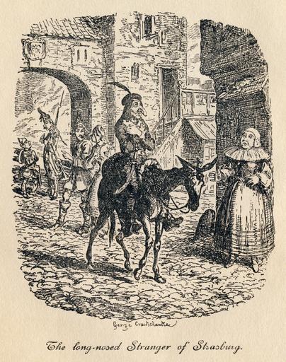 | Keywords: George Cruikshank - Tristram Shandy, Plate IV. The long-nosed Stranger of Strasburg.png From George Cruikshank's illustrations to Laurence Sterne's Tristram Shandy Plate IV The long-nosed Stranger of Strasburg Illustrates part of a long diversion on Tristram's father's favourite reading a collection of stories in Latin about noses The Life and Opinions of Tristram Shandy Gentleman and A Sentimental Journey Through France and Italy by Laurence Sterne With Illustrations by George Cruikshank London Hutchinson Co Paternoster Row 1906 This version published 1906 George Cruikshank 1792 “1878 PD-Old-100 Part of a series of illustrations of Tristram Shandy <gallery widths 200px heights 250px> File George Cruikshank - Tristram Shandy Plate I The Effects of Trim's Eloquence jpg Plate I The Effects of Trim's Eloquence<br/> PNG Scan File George Cruikshank - Tristram Shandy Plate II Obadiah leading in Dr Slop jpg Plate II Obadiah leading in Dr Slop<br/> PNG Scan File George Cruikshank - Tristram Shandy Plate III The Jack-boots transformed into Mortars jpg Plate III The Jack-boots transformed into Mortars<br/> PNG Scan File George Cruikshank - Tristram Shandy Plate IV The long-nosed Stranger of Strasburg jpg Plate IV The long-nosed Stranger of Strasburg<br/> PNG Scan File George Cruikshank - Tristram Shandy Plate V My Uncle Toby on his Hobby-horse jpg Plate V My Uncle Toby on his Hobby-horse<br /> PNG Scan File George Cruikshank - Tristram Shandy Plate VI Trim's relation of Tristram's misfortune jpg Plate VI Trim's relation of Tristram's misfortune<br/> PNG Scan File George Cruikshank - Tristram Shandy Plate VII The Quarrel of Slop and Susannah jpg Plate VII The Quarrel of Slop and Susannah<br/> PNG Scan File George Cruikshank - Tristram Shandy Plate VIII The Smoking Batteries jpg Plate VIII The Smoking Batteries<br/> PNG Scan </gallery> minor cleanup and levels adjustment George Cruikshank's illustrations of Tristram Shandy 1832 4 GCTS |