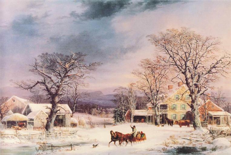 Keywords: george durrie painting oil on canvas art artistic artistry sky clouds trees nature outside country countryside scenic landscape winter snow ice farm lane house barn sled horses