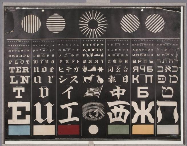 Keywords: George Mayerle test chart (1)..JPG en Double-sided a positive image of the test chart appears on one side a negative image on the reverse This record is for the negative image The color boxes at the bottom of the chart are applied colored strips Mayerle ™s eye chart combined four subjective tests done during an eye examination Running through the middle of the chart the seven vertical panels test for acuity of vision with characters in the Roman alphabet for English German and other European readers and also in Japanese Chinese Russian and Hebrew A panel in the center replaces the alphabetic characters with symbols for children and adults who were illiterate or who could not read any of the other writing systems offered Directly above the center panel is a version of the radiant dial that tests for astigmatism On either side of that are lines that test the muscular strength of the eyes Finally across the bottom boxes test for color vision a feature intended especially according to one advertisement for those working on railroads and steamboats --NLM Hidden treasure 2013-09-25 12 30 35 Courtesy of the National Library of Medicine Images from the History of Medicine IHM http //ihm nlm nih gov/images/C06230 Also showcased in the book Hidden Treasure New York NY Blast Books 2012 p 137 HMD Prints Photos call number PP059701b map Mayerle George Custom license marker 2013 09 25 PD-USGov Uploaded with UploadWizard Eye charts |