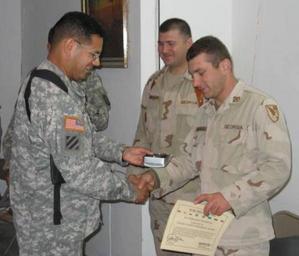 | Keywords: Georgian Soldiers recognized for quick action DVIDS72164.jpg  en Lt Col Anthony Gonzalez left the 214th Fires Brigade deputy commanding officer and FOB Delta garrison commander presented Cpl Shermanin Tediashvili right and Capt Zura Tskhadadze 3rd Georgian Infantry Brigade with a 214th Fires Brigade Safety Award Certificate and the 3rd Infantry Division safety knife Tediashvili and Tskhadadze contained an electrical fire in a latrine trailer until fire department personnel were able to arrive and extinguish the blaze Photo/Maj Robert Evans 2008-01-11 https //www dvidshub net/image/72164 72164 2008-01-11 10 04 FORWARD OPERATING BASE DELTA IQ PD-USGov Forward Operating Base Delta 3rd Infantry Division United States Images from DoD uploaded by Fæ |