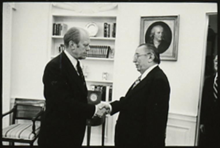 Keywords: Gerald Ford and İhsan Çağlayangil (cropped).jpg White House Photographic Office WHPO is housed at the Gerald R Ford Presidential Library a branch of the National Archives and Records Administration NARA <br/><br/> This file is a 200 dpi photo contact sheet having images from roll of film A8922 of the August 9 1974 - January 20 1977 Gerald R Ford White House Photographic Office Series A0001-A9999 and B0001-B2886 photographs <br/><br/> The date on the photo contact sheet is the date the roll of film was processed not necessarily the date the photographs were taken See table below for additional details 1976-03-24 Gerald R Ford Presidential Library Image http //www fordlibrarymuseum gov/library/whphotos/A8922_NLGRF jpg A8922_NLGRF jpg from http //www fordlibrarymuseum gov/library/whphotos/19760324whpo pdf White House Photographs March 24 1976 of the http //www fordlibrarymuseum gov/Library/whphotos/whpo asp White House Photographic Collection page White House Photographic Office WHPO - Thomas PD-USGov Institution Institution Gerald R Ford Presidential Library Table wikitable sortable + Photo contact sheet A8922 U S President Ford Administration Gerald R Ford Library Frame s Tone Subject proper Subject generic Names Geographic Location Photographer Date - 4A-6A BW Remarks to Press Announcing the National Swine Flu Immunization Program; Sec Asst Sec HEW CDC Director Sencer; pioneers in polio vaccine Salk Sabin GRF at podium Mathews at podium; all may not be shown; l-r Salk Cooper x GRF Mathews GRF F David Mathews Dr Theoodore Cooper Dr David Sencer Dr Jonas Salk Dr Albert Sabin Media Press Briefing Room Thomas 1976-03-24 - 7A-25A BW Meeting with Turkish Officials Foreign Affairs Minister for Turkey Foreign Affairs Ministry SecGeneral; Dir International Security Affairs and Turkish Ambassador entering handshaking; seated in chairs by fireplace and sofas; press photo op; Kissinger talking 21A-25A; various angles and distances; all not in every frame GRF Ihsan Caglayangil Sukru Elekdag Ercumet Yavuzalp Amb Melih Esenbel Amb Wm Macomber Jr Kissinger Scowcroft; Media Oval Office Thomas 1976-03-24 Gerald R Ford Presidential Library and Museum-cooperation PD-USGov Contact sheets by the Ford White House March 1976 Ford A8922 NLGRF photo contact sheet 1976-03-24 Gerald Ford Library jpg Relations of Turkey and the United States in 1976 |