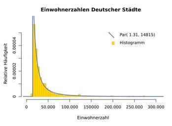 Keywords: German Cities Pareto Density - de.svg de Rohdaten von File Powercitiesrp png visualisiert als Histogramm mit passender Pareto-Verteilung Wahrscheinlichkeitsdichte 2011-06-17 own Accountalive cc-zero Uploaded with UploadWizard Pareto distribution |