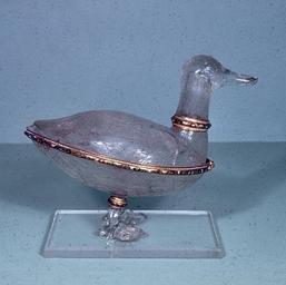 Keywords: German - Covered Bowl in the Shape of a Duck - Walters 4175.jpg This dazzling carved polished and engraved covered bowl is amusingly shaped as a duck and would have been judged by contemporaries as a triumph of artifice in the imitation of nature in such an unlikely and difficult material Contemporaries would also have admired the virtuosity of the execution not only in the carving but in the engraving of the feathers By 1600 the skills in carving rock crystal associated with the workshops of Milan were also found at the courts of central Europe Bowl ca 1600; Mounts 19th century rock crystal glass enamel cm 16 4 accession number 41 75 37039 Prince Baucino Palermo Jacques Seligmann Paris by purchase Henry Walters city Baltimore Walters Art Museum Henry Walters Acquired by Henry Walters 1914 World of Wonder The Walters Art Gallery Baltimore 1971-1972 place of origin north Italy Walters Art Museum license Glassware in the Walters Art Museum Baroque art in the Walters Art Museum German art in the Walters Art Museum Ducks in art Glass engraving Media contributed by the Walters Art Museum needs category review |