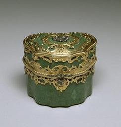 Keywords: German - Heart-Shaped Toilet Case - Walters 57842 - Closed.jpg Small precious cases like this example often contained women's toiletries or sewing tools This elaborate heart-shaped case contains two glass scent bottles with gold stoppers a mirror a folding ivory writing tablet a gold bodkin two gold toothpicks and a miniature pair of gold tweezers in small perfectly fitting compartments A hollow casing for a lead pencil has a silver top set with a diamond for writing on glass The button used to open the case and the floral element on its front as well as the oval ornament on its top are executed in silver set with diamonds and emeralds ca 1750 case gold wood frame covered with shagreen silver diamonds emeralds; utensils gold glass enamel ivory steel cm 6 03 4 45 accession number 57 842 17479 Henry Walters Baltimore date and mode of acquisition unknown Walters Art Museum Henry Walters Acquired by Henry Walters Objects of Vertu Precious Works of the Eighteenth Century The Walters Art Gallery Baltimore 1984 Bedazzled 5 000 Years of Jewelry from the Walters Art Museum Frist Center for the Visual Arts Nashville; The John and Mable Ringling Museum of Art Sarasota; The Walters Art Museum Baltimore 2006-2009 Bedazzled 5 000 Years of Jewelry El Paso Museum of Art El Paso 2010 place of origin Germany Walters Art Museum license Shagreen Cases German art in the Walters Art Museum Media contributed by the Walters Art Museum needs category review 1750s jewellery Toilet services Gold boxes |