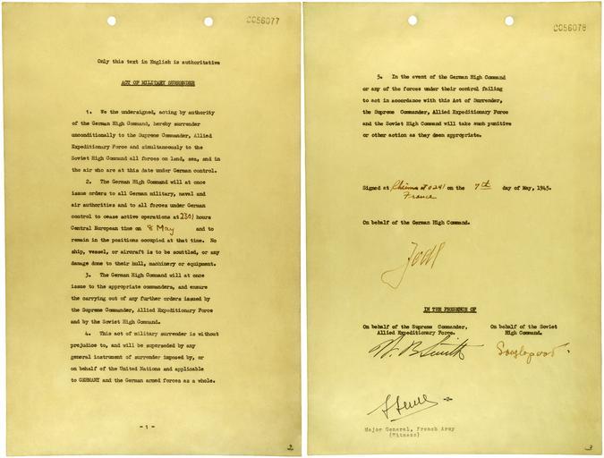 Keywords: German instrument of surrender1a.jpg This instrument of surrender was signed on May 7 1945 at Gen Dwight D Eisenhower's headquarters in Rheims by Gen Alfred Jodl Chief of Staff of the German Army At the same time he signed three other surrender documents one each for Great Britain Russia and France Signatories On behalf of the German High Command JODL IN THE PRESENCE OF On behalf of the Supreme Commander Allied Expeditionary Force W B SMITH On behalf of the Soviet High Command SOUSLOPAROV F SEVEZ Major General French Army Witness http //www ourdocuments gov/doc php flash true doc 78 ourdocuments gov 1945-05-07 Office of War Information PD-USGov German Instrument of Surrender May 7 1945 - page 1 jpg German Instrument of Surrender May 7 1945 - page 2 jpg Interim step in the restoration of Image German instrument of surrender jpg Stains and dirt removed Levels adjusted but no other change World War II German surrender documents German surrender of 7 May 1945 in Reims François Sevez |