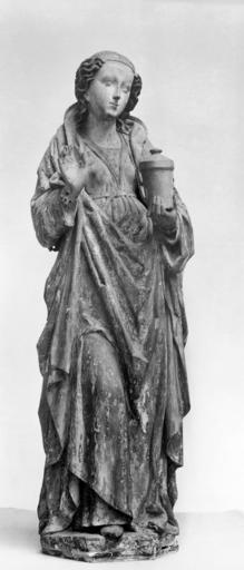 Keywords: German - Saint Mary Magdalene - Walters 27297 - Three Quarter.jpg This figure of Mary Magdalene identified by the ointment jar is probably from a group of the Three Marys at the Tomb On Easter morning the women approached the tomb of Christ in order to anoint the body Mary Magdalene's surprise at finding the tomb empty is delicately expressed by her raised right hand and backward step Such carved wooden statues came from a church interior Most statues of this type were originally covered by gesso a mixture of glue and plaster of Paris and then painted in vibrant colors with some details gilded; only traces of these decorations still remain ca 1480 1530 late Gothic-Northern Renaissance pine paint cm 119 accession number 27 297 21982 Henry Walters Baltimore by purchase Walters Art Museum Henry Walters Acquired by Henry Walters place of origin Ulm Germany Walters Art Museum license Renaissance sculpture in the Walters Art Museum Medieval art in the Walters Art Museum German art in the Walters Art Museum Statues of Mary Magdalene Wooden statues |