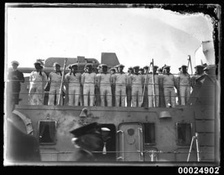 Keywords: koln german cruiser germancruiser german naval visit navalvisit navy naval sydney harbour sydneyharbour samuel j hood collection samueljhoodcollection sydney cove sydneycove circular quay circularquay west circular quay westcircularquay crowds german navy germannavy sailors blackandwhite photo border monochrome outdoor skyline architecture black and white This photo is part of the Australian National Maritime Museum’s Samuel J. Hood Studio collection. Sam Hood (1872-1953) was a Sydney photographer with a passion for ships. His 60-year career spanned the romantic age of sail and two world wars. The photos in the collection were taken mainly in Sydney and Newcastle during the first half of the 20th century. The ANMM undertakes research and accepts public comments that enhance the information we hold about images in our collection. This record has been updated accordingly. Photographer: Samuel J. Hood Studio Collection Object no. 00024902 This photo is part of the Australian National Maritime Museum’s Samuel J. Hood Studio collection. Sam Hood (1872-1953) was a Sydney photographer with a passion for ships. His 60-year career spanned the romantic age of sail and two world wars. The photos in the collection were taken mainly in Sydney and Newcastle during the first half of the 20th century. The ANMM undertakes research and accepts public comments that enhance the information we hold about images in our collection. This record has been updated accordingly. Photographer: Samuel J. Hood Studio Collection Object no. 00024902