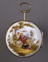 Keywords: German - Watch with a Scene of Musicians - Walters 58111.jpg Walters Art Museum artwork Anonymous German This watchcase is decorated with a scene of a man playing a flute a girl singing and a second man reclining holding the neck of a stringed instrument The composition is derived from L'Accord Parfait Perfect Accord ca 1719 by Antoine Watteau 1684-1721 now in the collection of the Los Angeles County Museum of Art AC1999 18 1 ca 1765 porcelain silver-gilt cm 4 6 accession number 58 111 35037 Anatole Demidoff Prince of San Donato 1812-1870 Tiffany and Company New York prior to 1893 mode of acquisition unknown on 1893 list no 42 Henry Walters Baltimore after 1893 mode of acquisition unknown Walters Art Museum Henry Walters Acquired by Henry Walters after 1893 place of origin Meissen Germany Walters Art Museum license German art in the Walters Art Museum Timepieces in the Walters Art Museum Meissen porcelain Pocket watches House of Demidov's collections 1760s jewellery 18th-century watches
