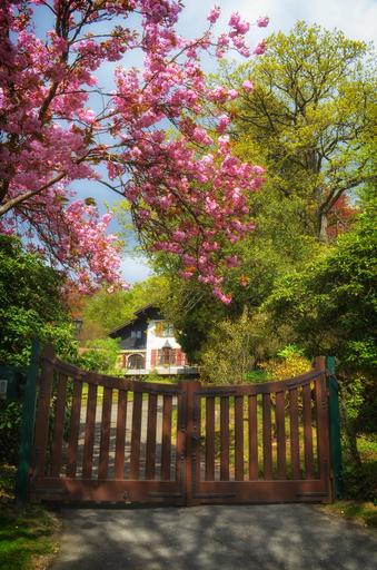 Keywords: germany house home gate entrance trees blooms summer spring nature outside