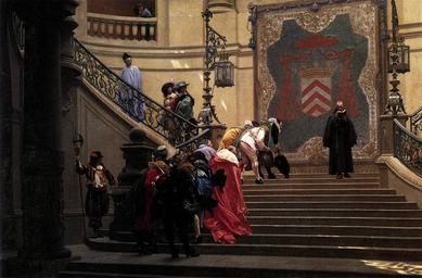 Keywords: Gérôme Eminence grise 1873.jpg Grey Eminence François Leclerc du Tremblay 1577 “1638 the right-hand man of Cardinal Richelieu Scan Richelieu Art and Power 2002 exhibition catalog edited by Hilliard Todd Goldfarb p 381 Montreal Montreal Museum of Fine Arts ; Cologne Wallraf-Richartz-Museum “ Fondation Corboud ; Ghent Belgium Snoeck-Ducaju Zoon ISBN 9789053494073 1873 Oil on canvas cm 68 6 101 Museum of Fine Arts Boston Lorna and Robert Rosenberg Gallery credit line Bequest of Susan Cornelia Warren accession number 03 605 The scene is anachronistic Tremblay died in 1638 but the Palais-Royal staircase depicted in a somewhat modified form was not constructed until c 1765 to the designs of Pierre Contant d'Ivry http //www mfa org/collections/object/leminence-grise-31214 Museum of Fine Arts Boston PD-old-100 François Leclerc du Tremblay 1873 paintings Portrait paintings of men of France Oil paintings from France Bowing France in history paintings History paintings by Jean-Léon Gérôme Paintings of coats of arms People on stairs 1870s paintings from France |