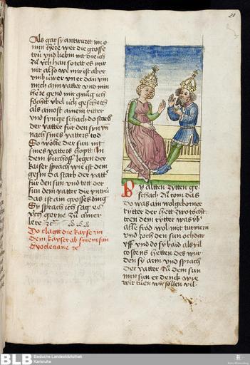 | Keywords: Gesta Romanorum - Donaueschingen 20r.jpg en Gesta Romanorum - Donaueschingen 145 a manuscript from Upper Swabia in Germany from circa 1452 de Titel Gesta Romanorum - Donaueschingen 145 Erschienen Oberschwaben um 1452 Online-Ausg Karlsruhe Badische Landesbibliothek 2012 Umfang 97 Bl ; 30 5 x 21 5 cm Anmerkung Original Handschrift auf Papier - Schreibsprache schwäbisch URN urn nbn de bsz 31-28735 info Signatur Donaueschingen 145 1452 http //digital blb-karlsruhe de/blbhsl/Handschriften/content/titleinfo/585870 Badische Landesbibliothek author other versions PD-Art Gesta Romanorum Uploaded with UploadWizard |