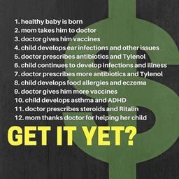 Keywords: anti vaccine vaccination vax disease health poison population control needle syringe 1. Healthy baby is born. 2. Mom takes him to doctor. 3. Doctor gives him vaccines. 4. Child develops ear infections and other issues. 5. Doctor prescribes antibiotics and Tylenol. 6. Child continues to develop infections and illness. 7. Doctor prescribes more antibiotics and Tylenol. 8. Child develops food allergies and eczema. 9. Doctor gives him more vaccines. 10. Child develops asthma and ADHD. 11. Doctor prescribes steroids and Ritalin. 12. Mom thanks doctor for helping her child. Anti Vaccination meme collected by A.J. Wilson of iPressThis at FlatEarth.Online, made by others. 1. Healthy baby is born. 2. Mom takes him to doctor. 3. Doctor gives him vaccines. 4. Child develops ear infections and other issues. 5. Doctor prescribes antibiotics and Tylenol. 6. Child continues to develop infections and illness. 7. Doctor prescribes more antibiotics and Tylenol. 8. Child develops food allergies and eczema. 9. Doctor gives him more vaccines. 10. Child develops asthma and ADHD. 11. Doctor prescribes steroids and Ritalin. 12. Mom thanks doctor for helping her child. Anti Vaccination meme collected by A.J. Wilson of iPressThis at FlatEarth.Online, made by others. |