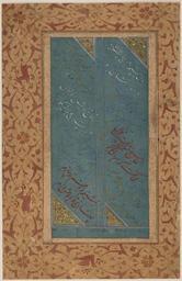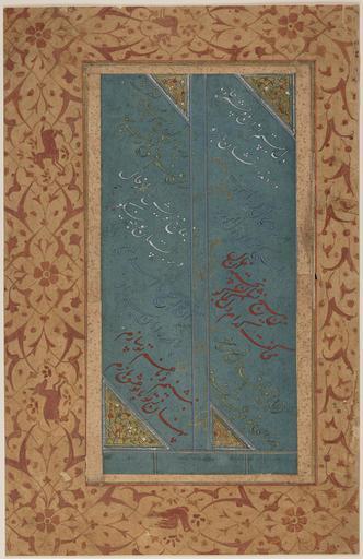 | Keywords: Ghazal by Sa'di.png  en This calligraphic fragment contains a ghazal lyric poem by the Persian poet Shaykh Sa'di died 1292 691 AH The verses describe a lover's search for his beloved and his request that she show herself to him The verses are written in nasta'liq script using white light blue red and yellow ink on a blue paper Rangin colored inks add variety to the composition and are found in a number of calligraphies produced during the 16th century The corners left open by the intersection of the diagonal verses and the rectangular frame are decorated by illuminated triangles or thumb pieces The text panel is framed by a border consisting of cream-colored paper decorated with gold flecks cut out and pasted to the folio The composition is placed on a larger beige sheet of paper decorated with deer birds and various vegetal motifs The fragment is neither dated nor signed However it appears to have been produced in Safavid Iran and placed later into a muraqqa' album of calligraphies fa غزل ŒÙ‡Ø§ÛŒÛŒ از سعدی به خط نستعلیق به سبک رنگین century 16 CE http //www wdl org/en/item/2423/ Ghazal by Sa'di Creator Saadi Custom license marker 2012 09 09 PD-old-100 Uploaded with UploadWizard Sa'di Persian manuscripts Manuscripts in Iran Nastaliq Rangin 16th-century illuminated manuscripts |