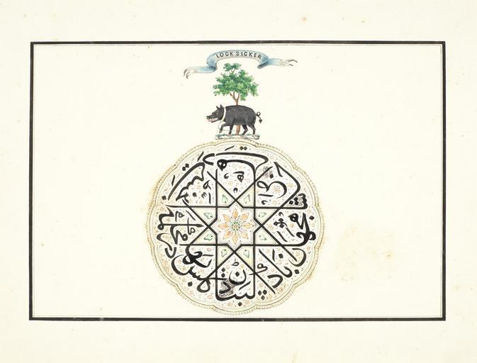Keywords: Ghulam Ali Khan 002.jpg A stylised calligraphic composition surmounted by an English-style insignia with the name Locksicker The roundel gives the name of Captain Douglas This is apparently Sir Thomas Monteath Douglas 1787-1868 He entered the East India Company's Bengal Army in 1806; served in many campaigns between 1809 and 1826; Lt-Colonel in 1834; ADC to Queen Victoria; left India about 1845; added the name of Douglas to his own in 1851; KCB and General in 1865 C F Buckland Dictionary of Indian Biography New York 1968 p 122 The emblem of a boar before an oak tree is apparently that of Sir Edward Robert Pearce Edgecombe 1851-1929 A series of 31 paintings by Ghulam Ali Khan fl 1817-55 consisting of views of monuments in and around Delhi and including four portraits of the last Mughal Emperor Bahadur Shah II reg 1837-58 and his sons Watercolour and gold on paper black margin rules three title pages three sheets of portraits all with identifying inscriptions in English and in Persian in nasta'liq script in black ink the portraits with further inscriptions in nasta'liq script with the date November 1852 Christian date written in Arabic in later mounts loose in contemporary green leather-covered despatch box the lid embossed in gold DELHEE 1854 Size paintings 290 x 215 mm and slightly smaller; mounts 318 x 394 mm ; box 435 x 365 x 110 mm http //www bonhams com/auctions/20833/lot/352/ circa 1852 1854 Ghulam Ali Khan PD-Art-100 Sketches of The Delhee Palace Delhee 1854 |